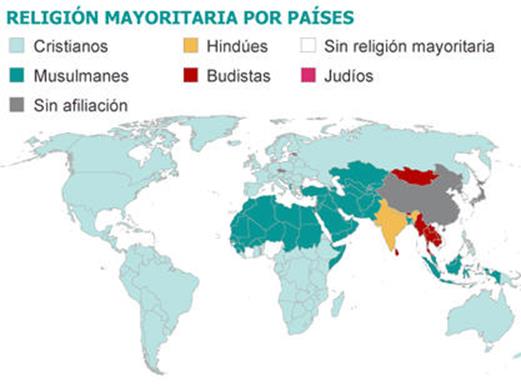 El estudio del Pew Forum on Religion & Public Life, que refleja el estado de la cuestión en 2010 y se basa en el análisis de más de 2.500 censos, investigaciones y registros de población, arroja los siguientes datos: los cristianos son mayoría en el mundo, el 31,5% de la población (2.200 millones, la mitad de ellos católicos), seguidos de cerca por los musulmanes (23,2%, 1.600 millones). Tras lo que el informe denomina “no afiliados” aparecen los siguientes grupos: hindúes (15% de la población mundial, o 1.000 millones); budistas (7,1%, 500 millones); seguidores de religiones populares (africanas o de tribus chinas, indios americanos y aborígenes australianos), el 5,9%, o 400 millones; otras religiones (taoísmo, sintoísmo, parsis, sijs, bahai’s, jainistas, seguidores de Tenrikyo, etcétera), el 0,8% (58 millones), y, finalmente, judíos, que solo suponen el 0,2% de la población mundial (14 millones, repartidos casi a partes iguales entre EE UU y Oriente Medio, es decir, Israel).
