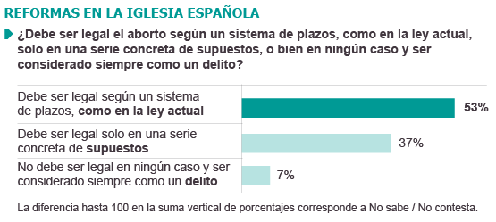 Entre los católicos, el 58% de los no practicantes abogan por una ley de plazos; un porcentaje cinco puntos superior a la opinión global de los entrevistados. La opción preferida para el 53% de los católicos practicantes habituales y para el 49% de los poco practicantes es, sin embargo, la de una ley de supuestos.