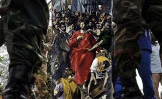 Manos asesinas por todos sitios lo rodean, gritos e insultos. Le están robando su túnica roja para dejarlo en cueros y romper el alma de alguien que ha pasado por el mundo tan sólo haciendo el bien. Aparte de sus ojos límpidos buscando el consuelo del cielo, todo el cuadro supura violencia.