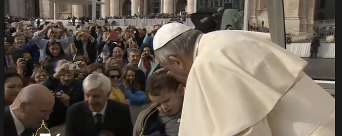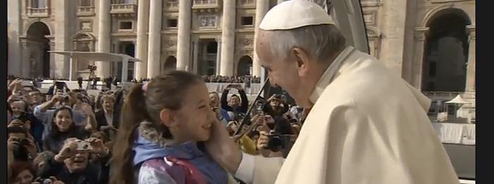 “¡Ven acá, no llores, no llores! ¿Ves, no pasa nada?“. El Papa Francisco tomó entre sus brazos a un pequeño que no paraba de gemir. El beso del Papa le tranquilizó. No así a un grupo de adolescentes que animaban a Bergoglio, desde la plaza de San Pedro, como si de una estrella de rock se tratara. “¡Francisco, I love you!“, dijeron varias. El jeep descubierto se paró en la mañana fría de San Pedro, y el Papa les contestó: “Y yo a ustedes“.