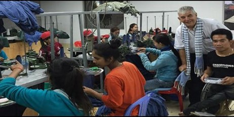 Vicente Laborda, así es. Yo había oído hablar de él porque llevaba unos tres años trabajando por aquí con sus fábricas. No nos conocíamos pero me habló, supimos yo de su vida y él de la mía, y se interesó por venir a ver esto. Me dijo que le mandara algunos chicos discapacitados a trabajar con él, y que les formaría. Fueron seis meses una docena de chavales y volvieron encantados. El siguiente paso fueron los talleres ya aquí, en Battambang. Dios me puso, en este proceso, cerca a Vicente, y aquí seguimos. Con su tenacidad, su cariño y su conocimiento del sector, cree en la sencillez de la gente camboyana. Él lo es: tiene un gran corazón y cree que los discapacitados también pueden tener un sitio.