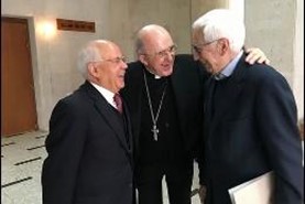 La foto lo dice todo. Se explica por sí misma. El cardenal Osoro que abraza y sonríe complacido con dos de los más importantes y prestigiosos teólogos españoles: Juan de Dios Martín Velasco y Marciano Vidal.