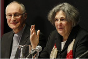 La escritora y escritora católica Phyllis Zagano habla durante un simposio sobre la historia y el futuro de las mujeres diáconas el 15 de enero en el campus del Lincoln Center de la Universidad de Fordham en la ciudad de Nueva York. Mirando es jesuita el padre. Bernard Pottier, miembro de la Comisión Teológica Internacional del Vaticano. (CNS / Gregory A. Shemitz)