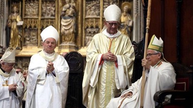 El arzobispo de Tarragona, Joan Planellas (d), el cardenal arzobispo de Barcelona, Joan Josep Omella (c), y el exnuncio Renzo Fratini. (EFE)