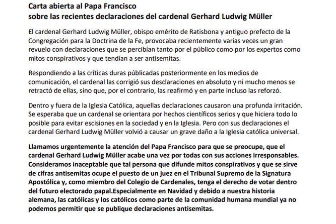 La misiva critica especialmente las polémicas de Müller respecto a las vacunas o la propia pandemia, así como algunas declaraciones que fueron tildadas como cercanas al antisemitismo, que no quiso modificar en momento alguno. “El cardenal no rectificó ni se retractó de sus declaraciones, sino que, por el contrario, las reafirmó y en algunos casos incluso las intensificó“, señalan los firmantes, hasta el momento medio millar.