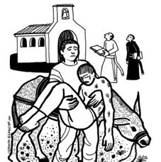 «Un hombre bajaba de Jerusalén a Jericó, cayó en manos de unos bandidos, que lo desnudaron, lo molieron a palos y se marcharon, dejándolo medio muerto. Por casualidad, un sacerdote bajaba por aquel camino y, al verlo, dio un rodeo y pasó de largo. Y lo mismo hizo un levita que llegó a aquel sitio: al verlo dio un rodeo y pasó de largo. Pero un samaritano que iba de viaje llegó adonde estaba él y, al verlo, se compadeció, y acercándose, le vendó las heridas, echándoles aceite y vino, y, montándolo en su propia cabalgadura, lo llevó a una posada y lo cuidó. Al día siguiente, sacando dos denarios, se los dio al posadero y le dijo: “Cuida de él, y lo que gastes de más yo te lo pagaré cuando vuelva”. ¿Cuál de estos tres te parece que ha sido prójimo del que cayó en manos de los bandidos?».