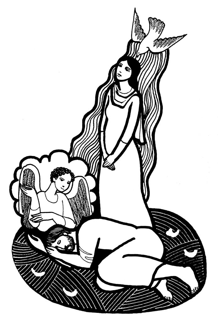 Pero, apenas había tomado esta resolución, se le apareció en sueños un ángel del Señor que le dijo: «José, hijo de David, no tengas reparo en llevarte a María, tu mujer, porque la criatura que hay en ella viene del Espíritu Santo. Dará a luz un hijo, y tú le pondrás por nombre Jesús, porque él salvará a su pueblo de los pecados.»